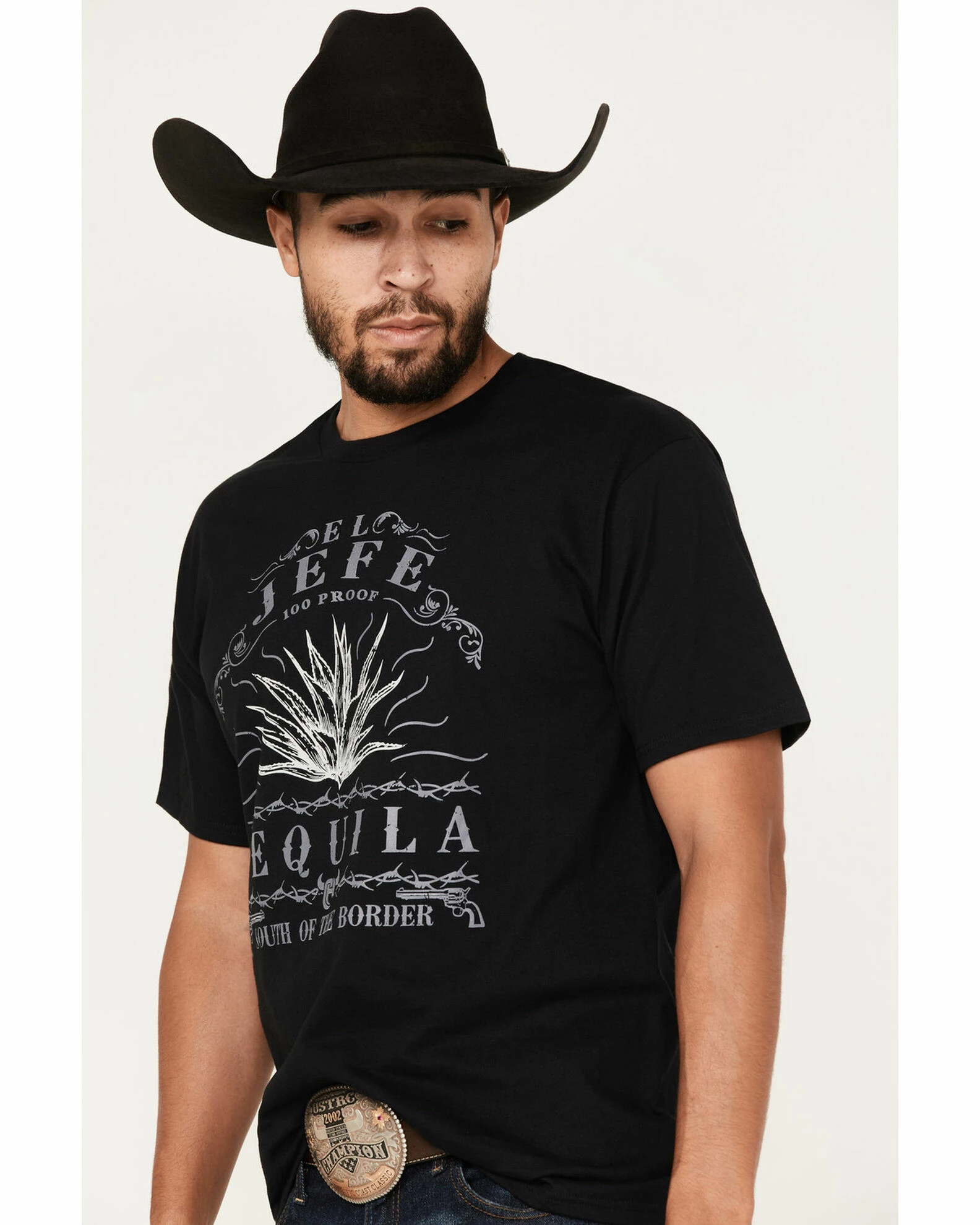 - “El Jefe Tequila South Of The Border” with agave plant, barb wire, and revolvers graphic on front