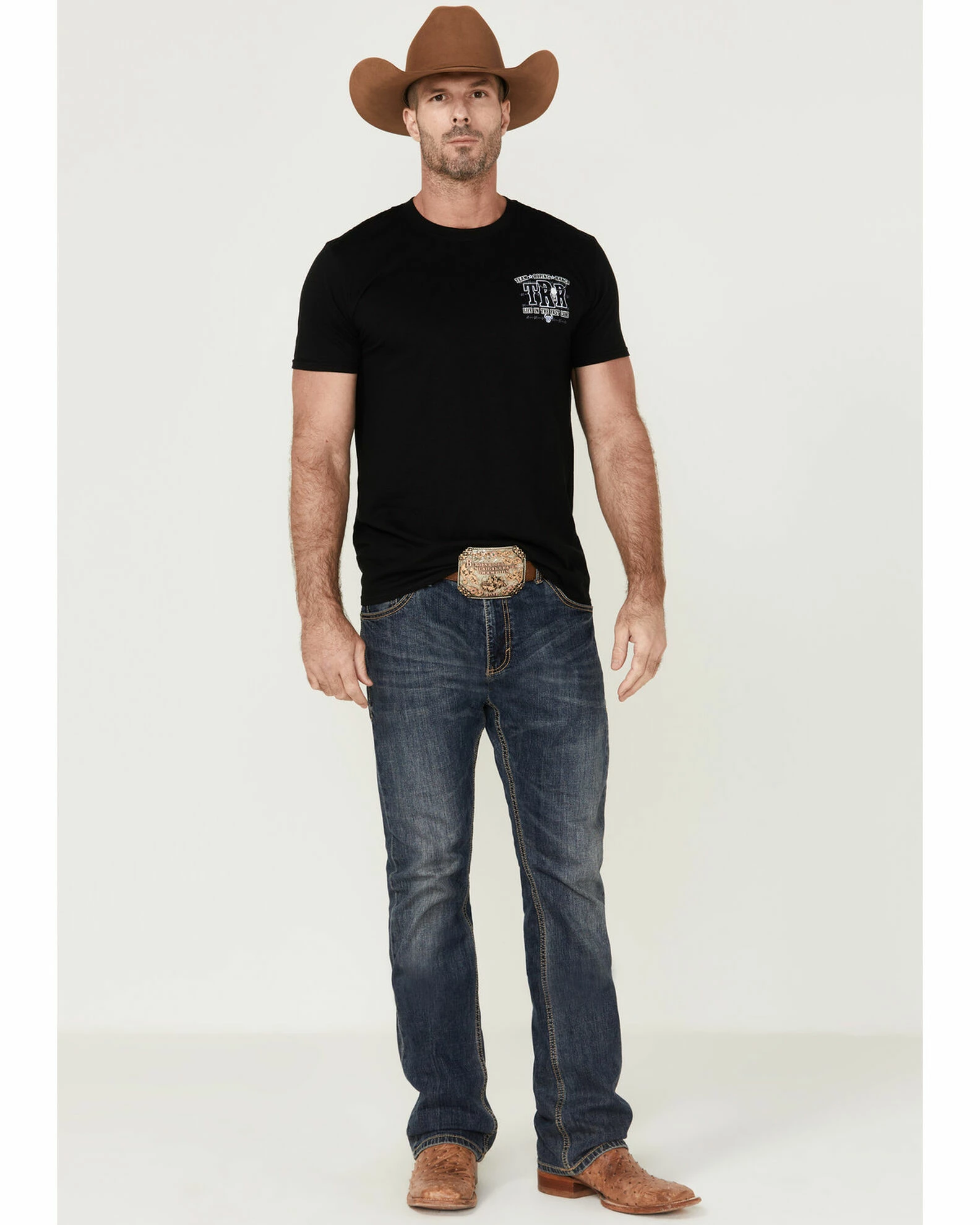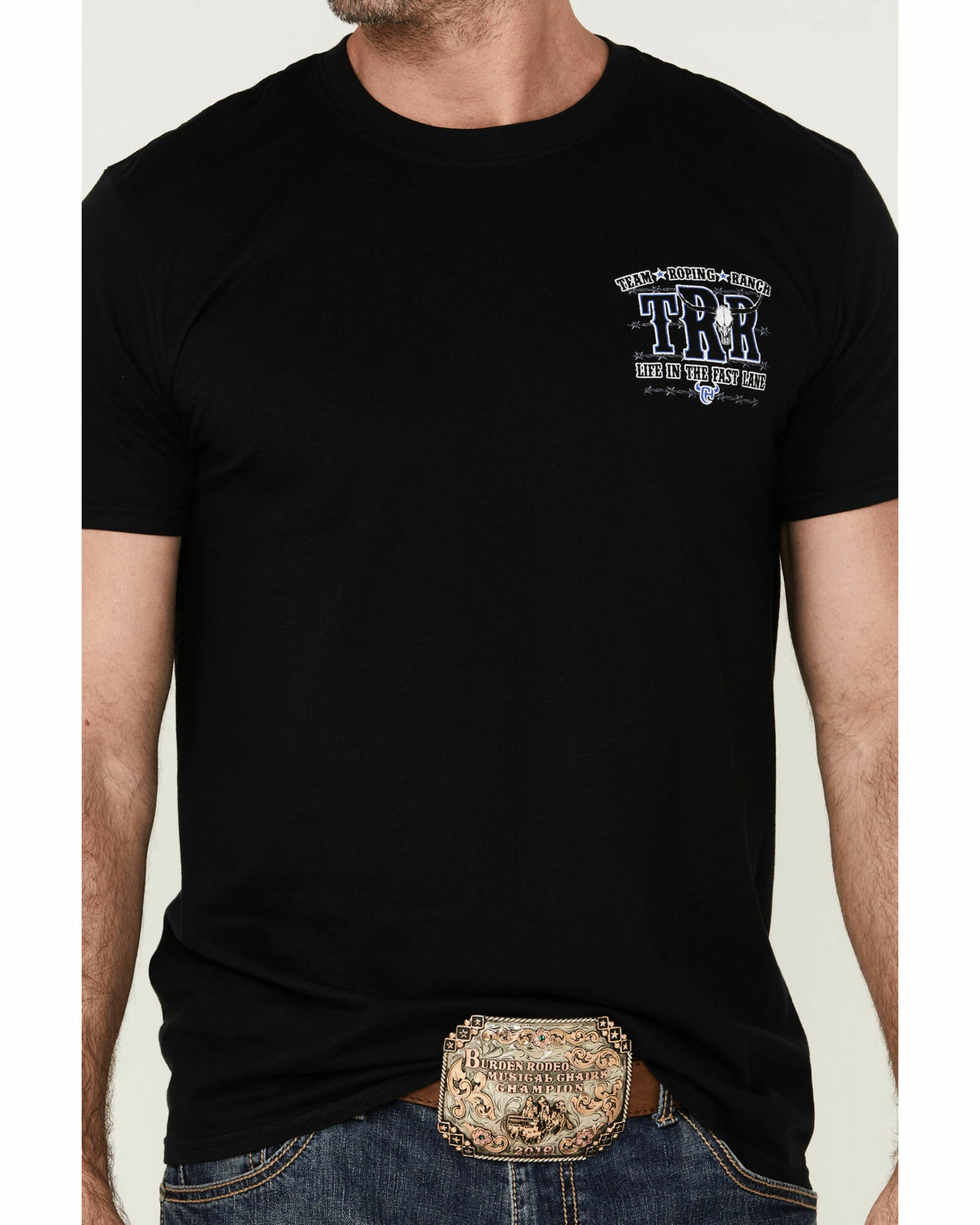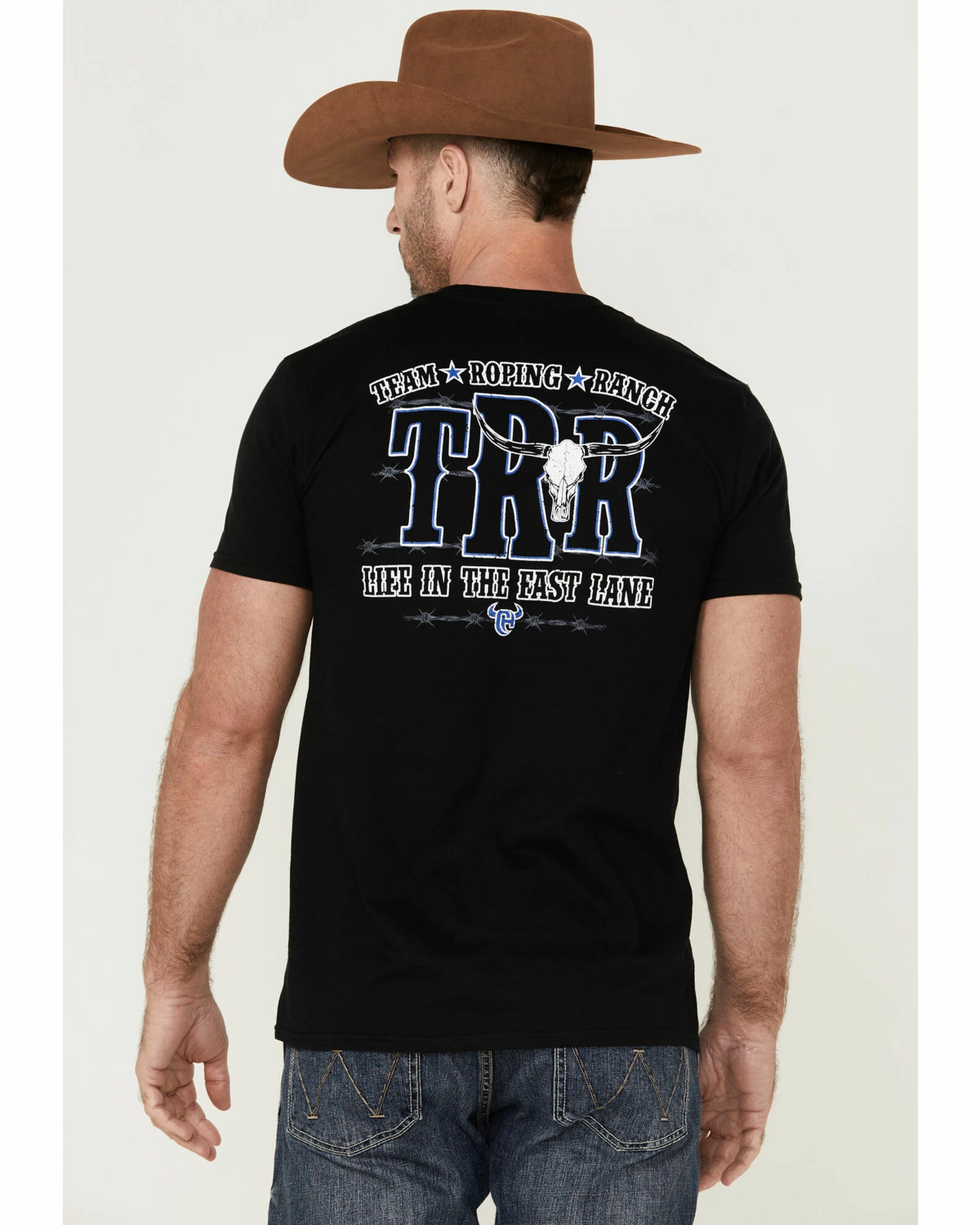 - “Team Roping Ranch” & “Life In The Fast Lane” with steerhead skull and barb wire graphic on left chest