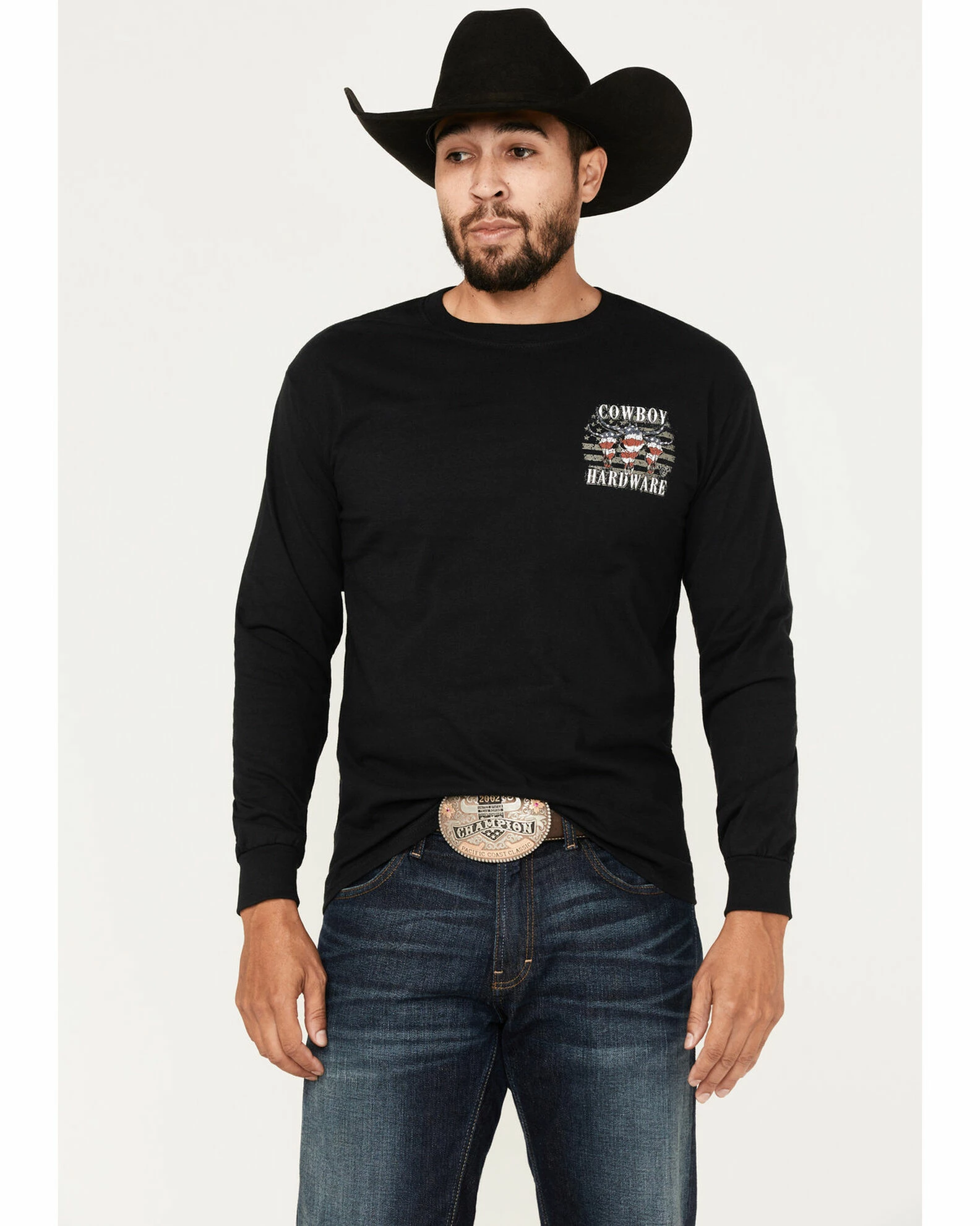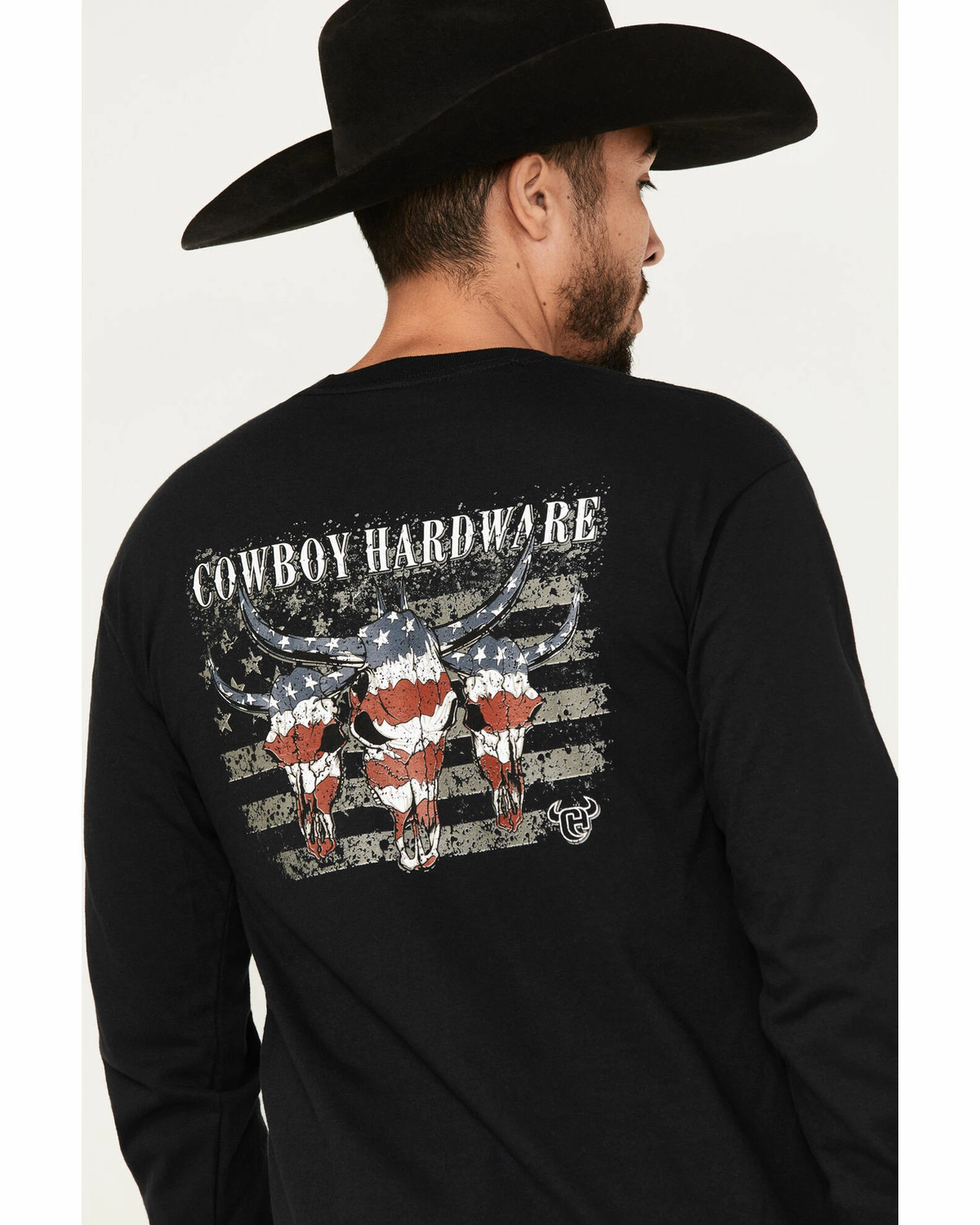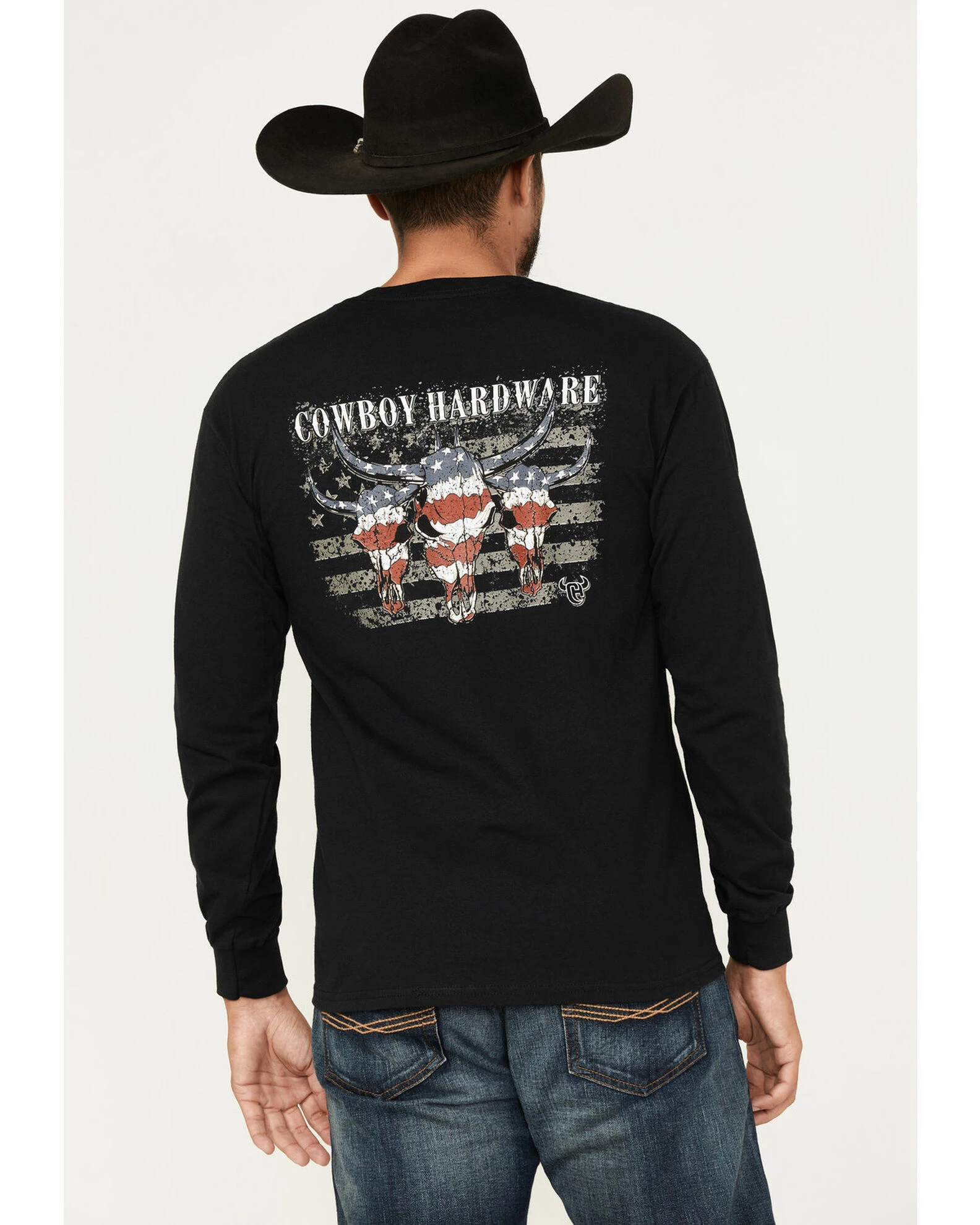 - Large “Cowboy Hardware” with triple American flag printed steerhead skulls graphic on back